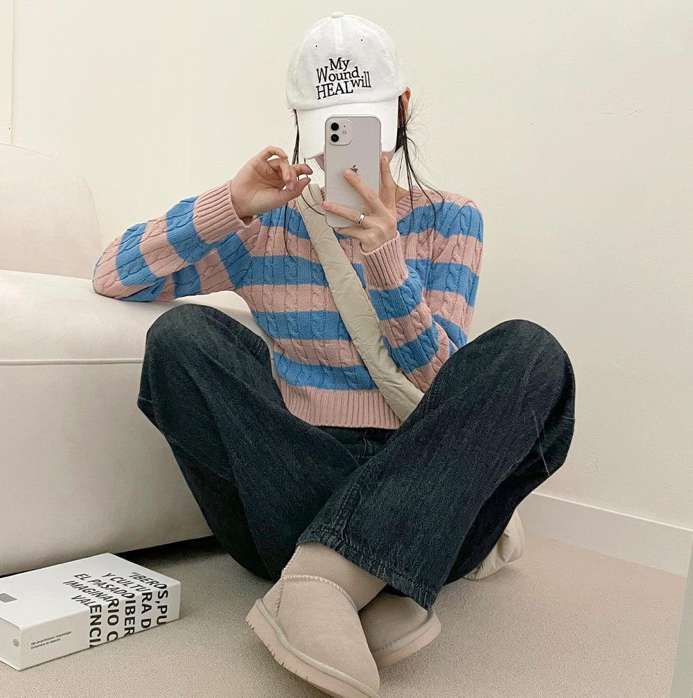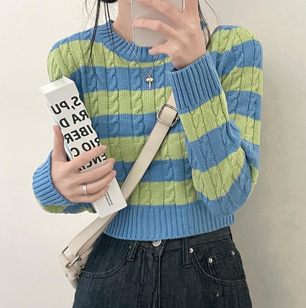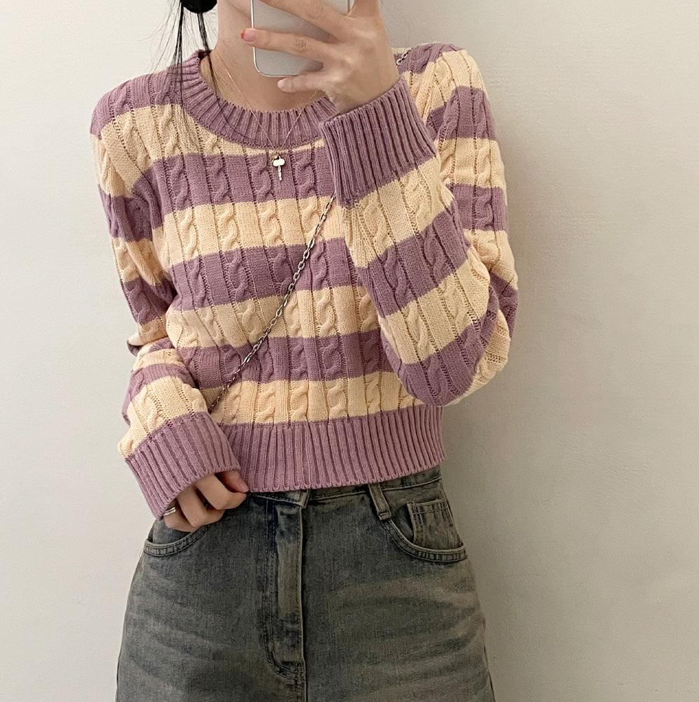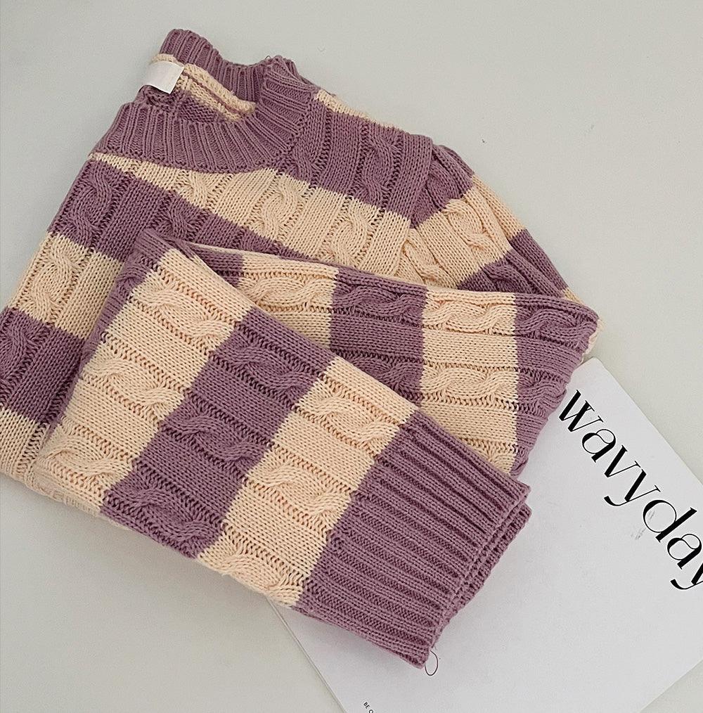 【現貨粉】韓製撞色條紋麻花針織衫(5color)<KR>