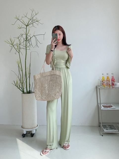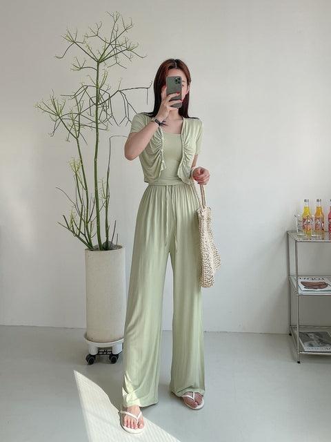 【現貨灰】抓皺外套背心褲子休閒套裝♡三件套