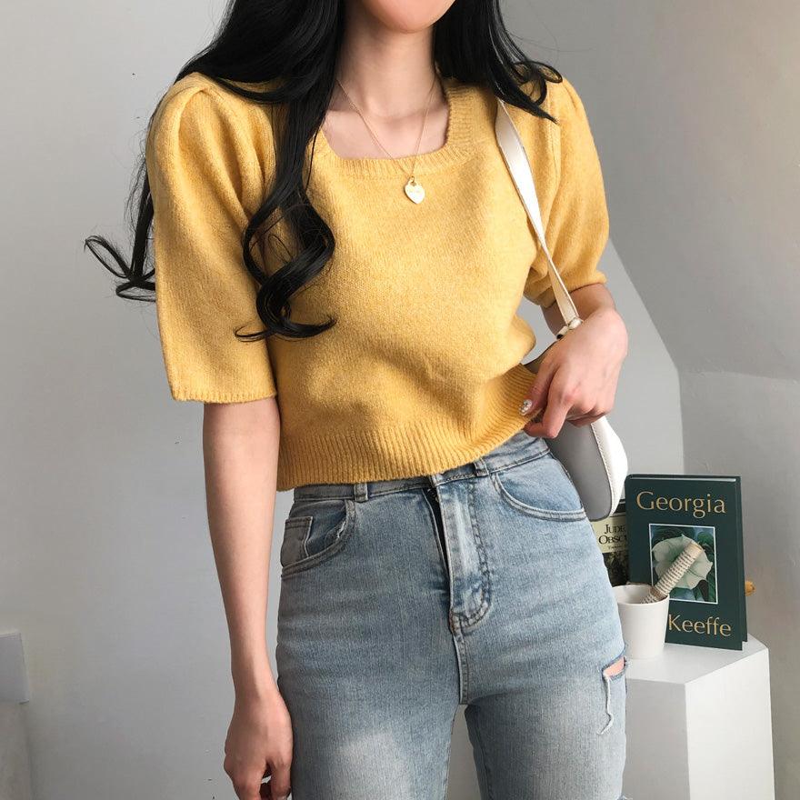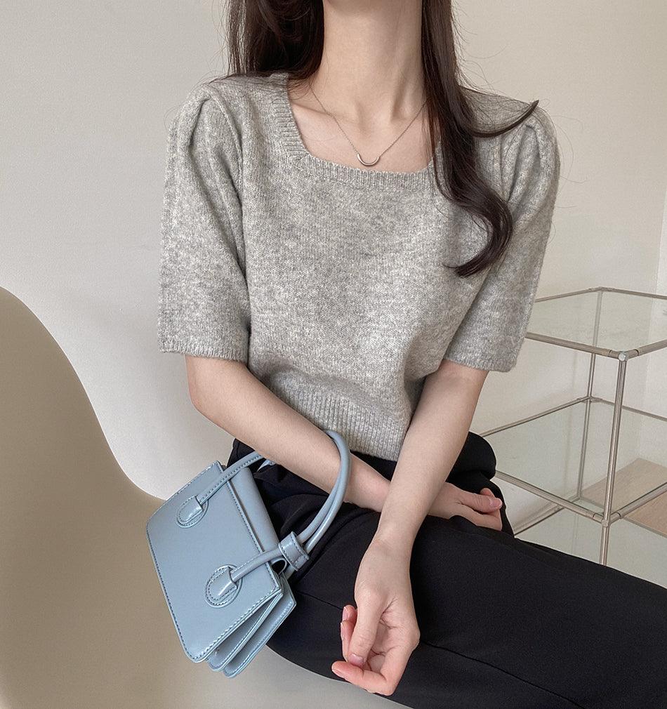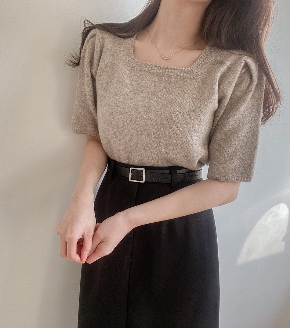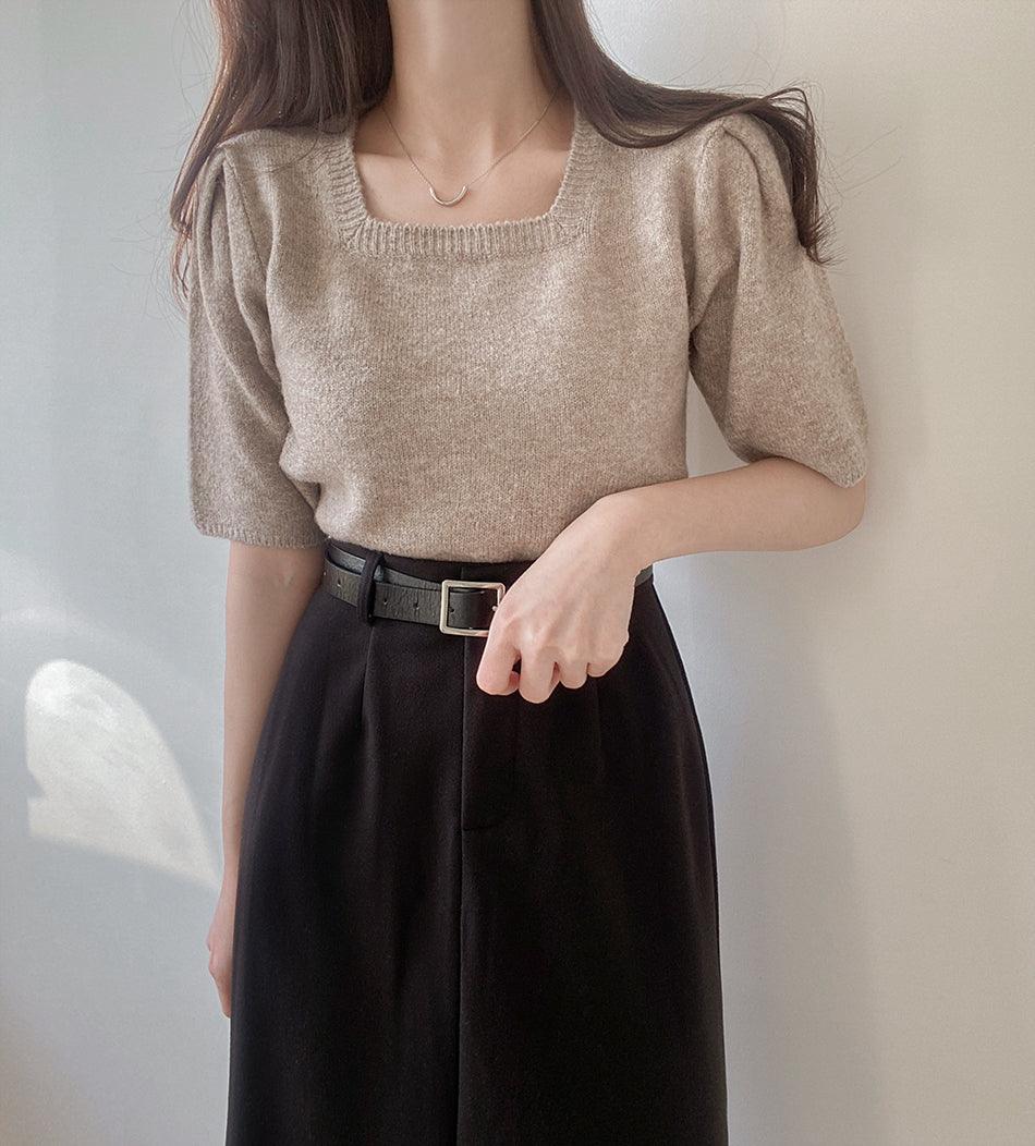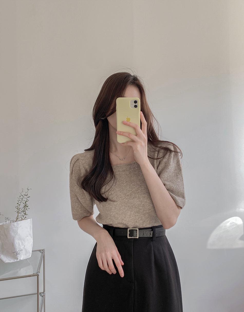 【現貨杏/氣質!】韓製混色感方領微泡袖針T