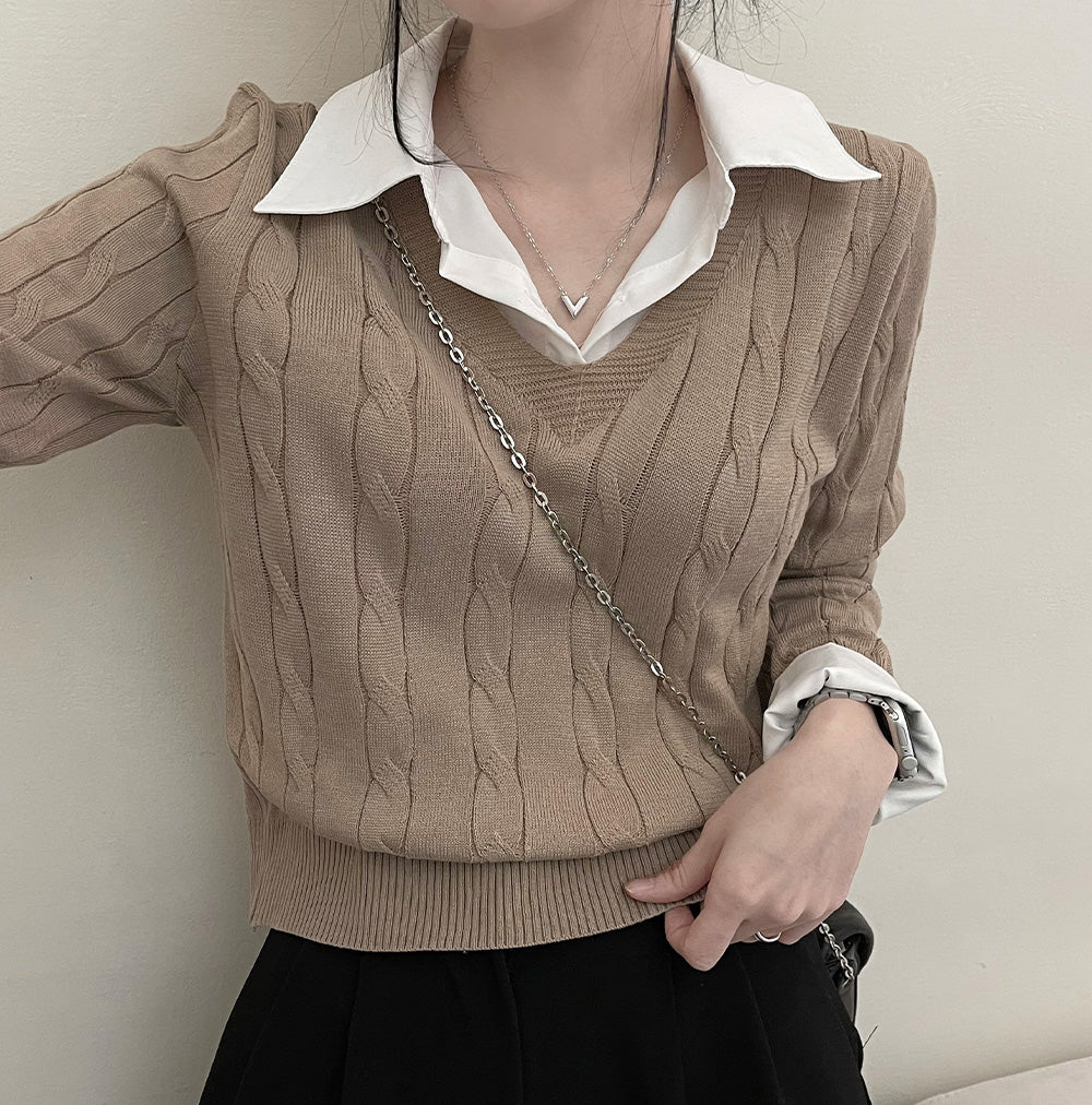 V領麻花針織拼接恤衫領和袖口