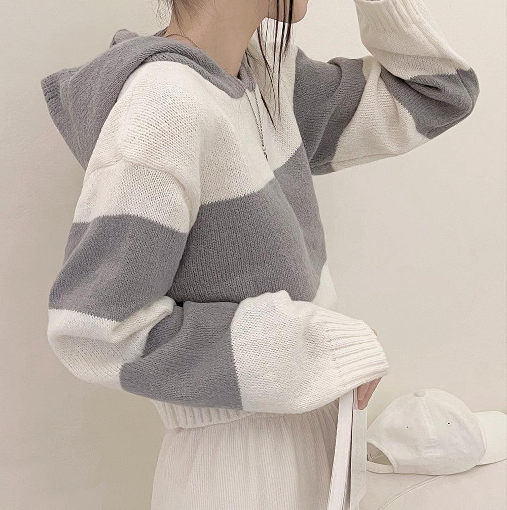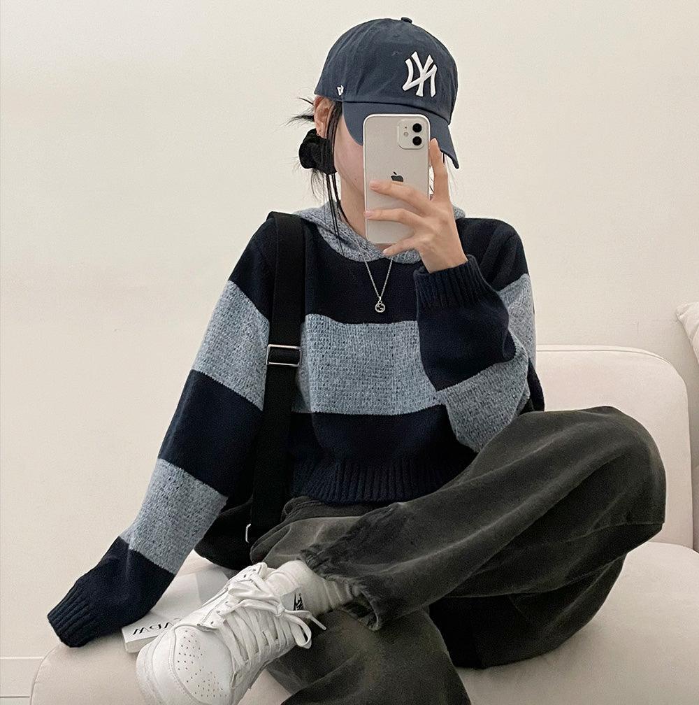 條紋短款連帽針織衫