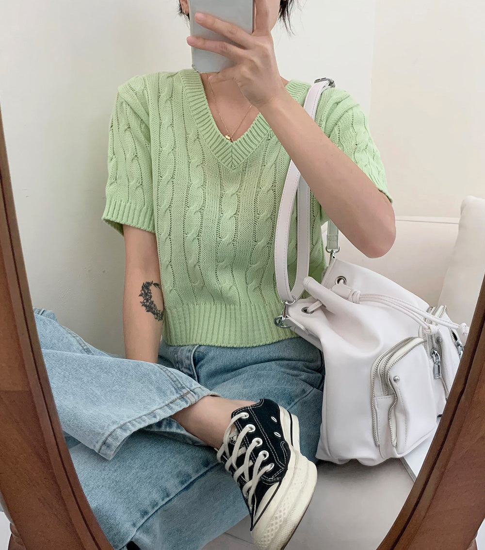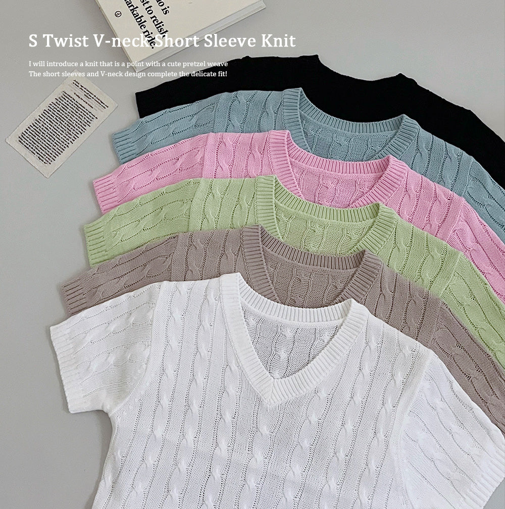 韓製麻花V領短袖針織衫(6color)